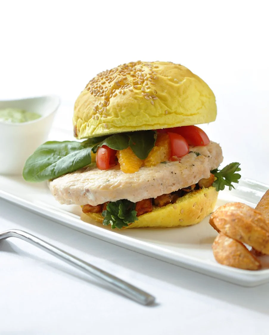 Hamburger di branzino alle erbe con pane alla curcuma, pomodorini confit, cipolle tostate, crema di cheddar