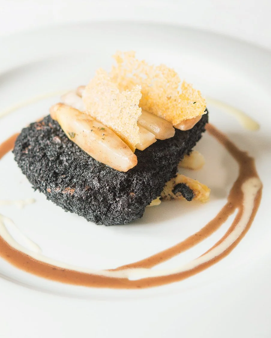 Filetto di Fassona in panatura di cenere di cipolla con asparagi bianchi di Bassano, patate fondant e ristretto alla croatina