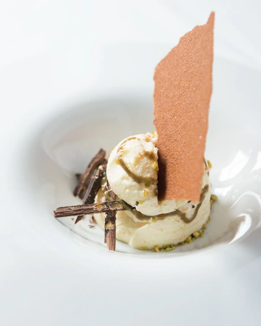 Ricotta di capra mantecata con zeste d’arancia, crema di pistacchio di Bronte, cialda di farina di mandorle con miele di castagno e fusione di cacao
