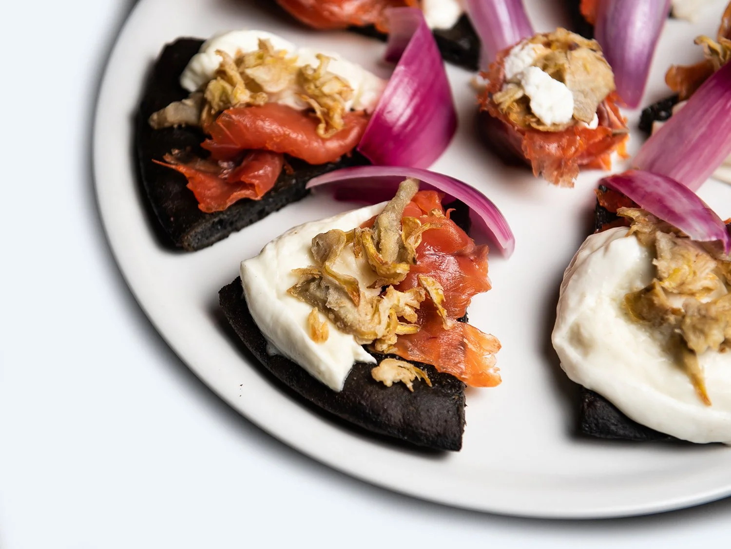 Pizza al carbone vegetale con trota marinata a secco, carciofi croccanti, stracciatella e cipolla di Tropea in agrodolce